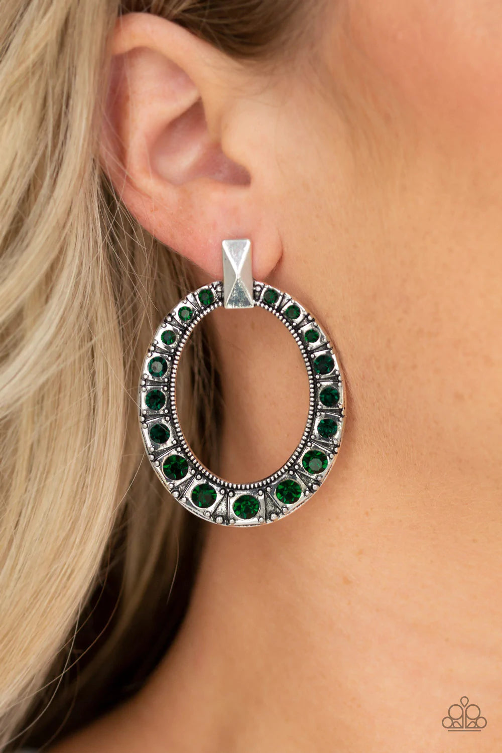 Featuring a faceted silver fitting, a beveled silver hoop is encrusted in glittery green rhinestones that gradually increase near the bottom of the ornate frame for an edgy finish. Earring attaches to a standard post fitting.
