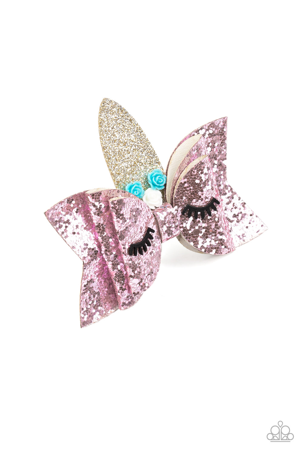 Decorated in white and blue resin roses, a sparkling gold horn crowns a glittery pink hair bow featuring suede eyelashes, creating an adorable unicorn. Features a standard hair clip on the back.
