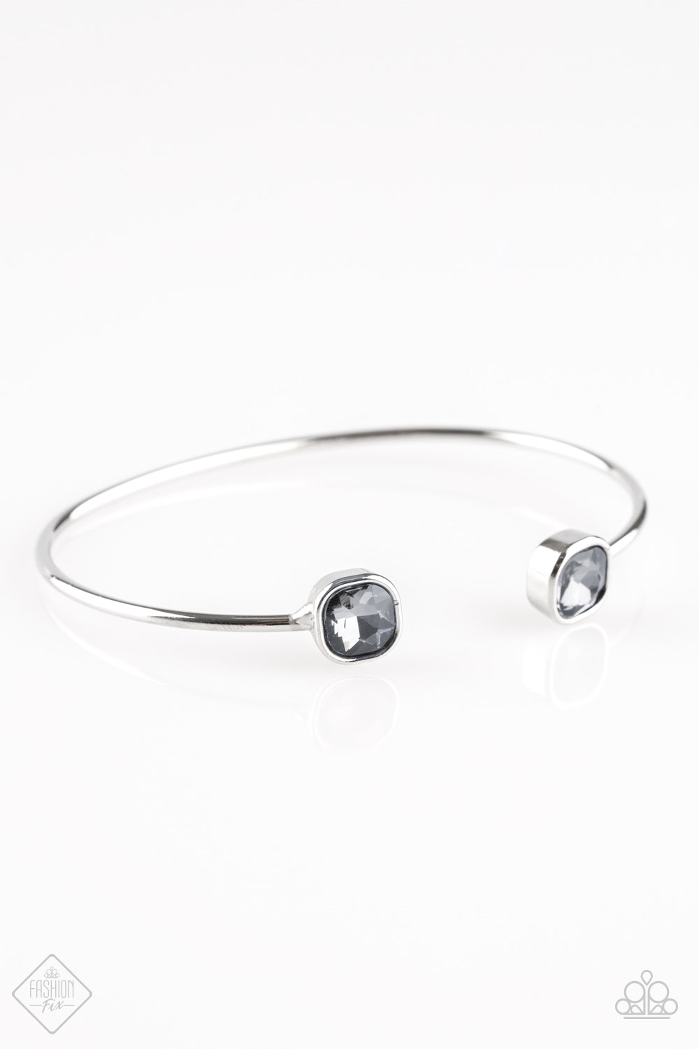 Attached to a curling silver bar, square smoky rhinestones are pressed into silver fittings, creating a dainty cuff.